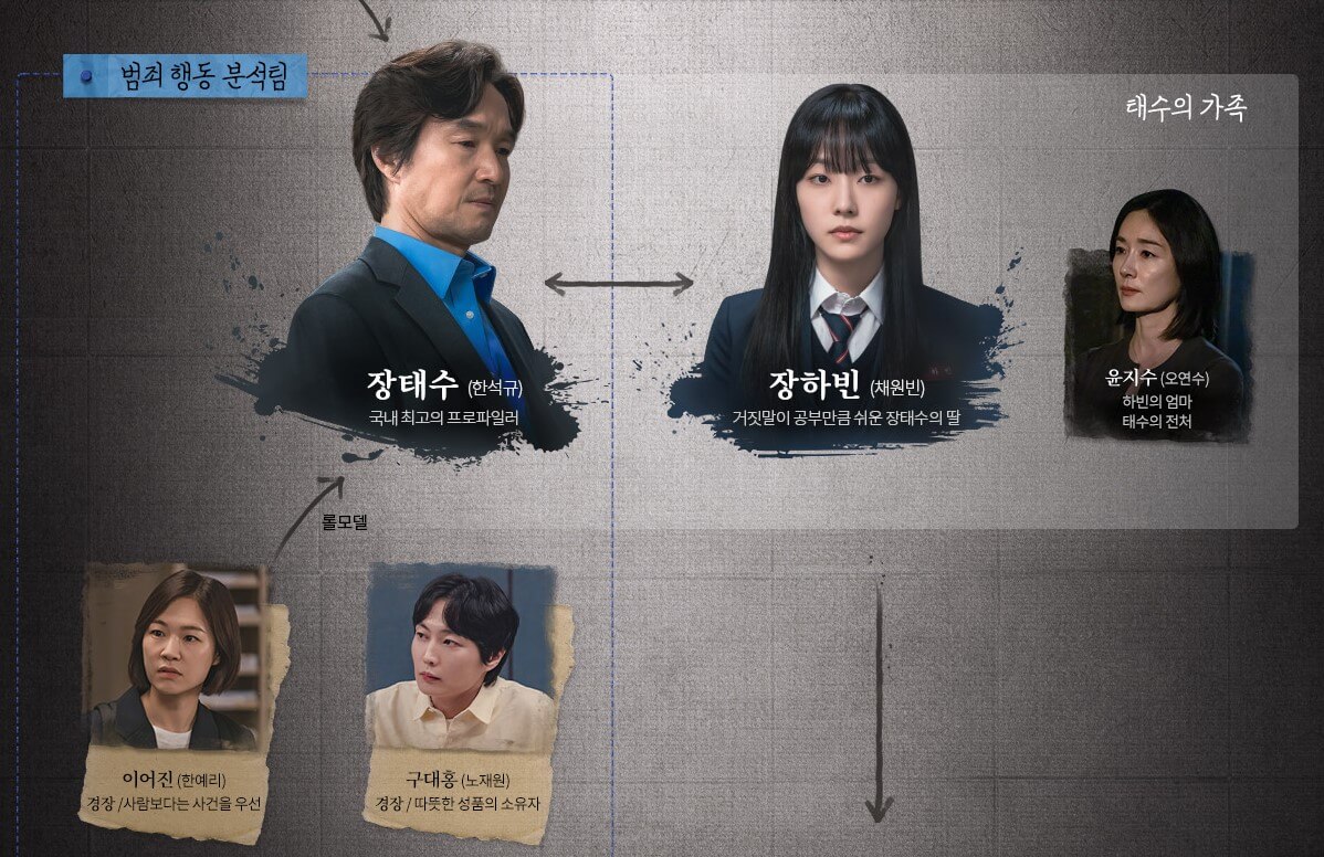 국내 최고의 프로파일러가 수사 중인 살인사건에 얽힌 딸의 비밀과 마주하고, 처절하게 무너져가며 심연 속의 진실을 쫓는 부녀 스릴러이며 드라마의 주요 등장인물들은 각기 다른 배경과 성격을 가지고 있습니다.